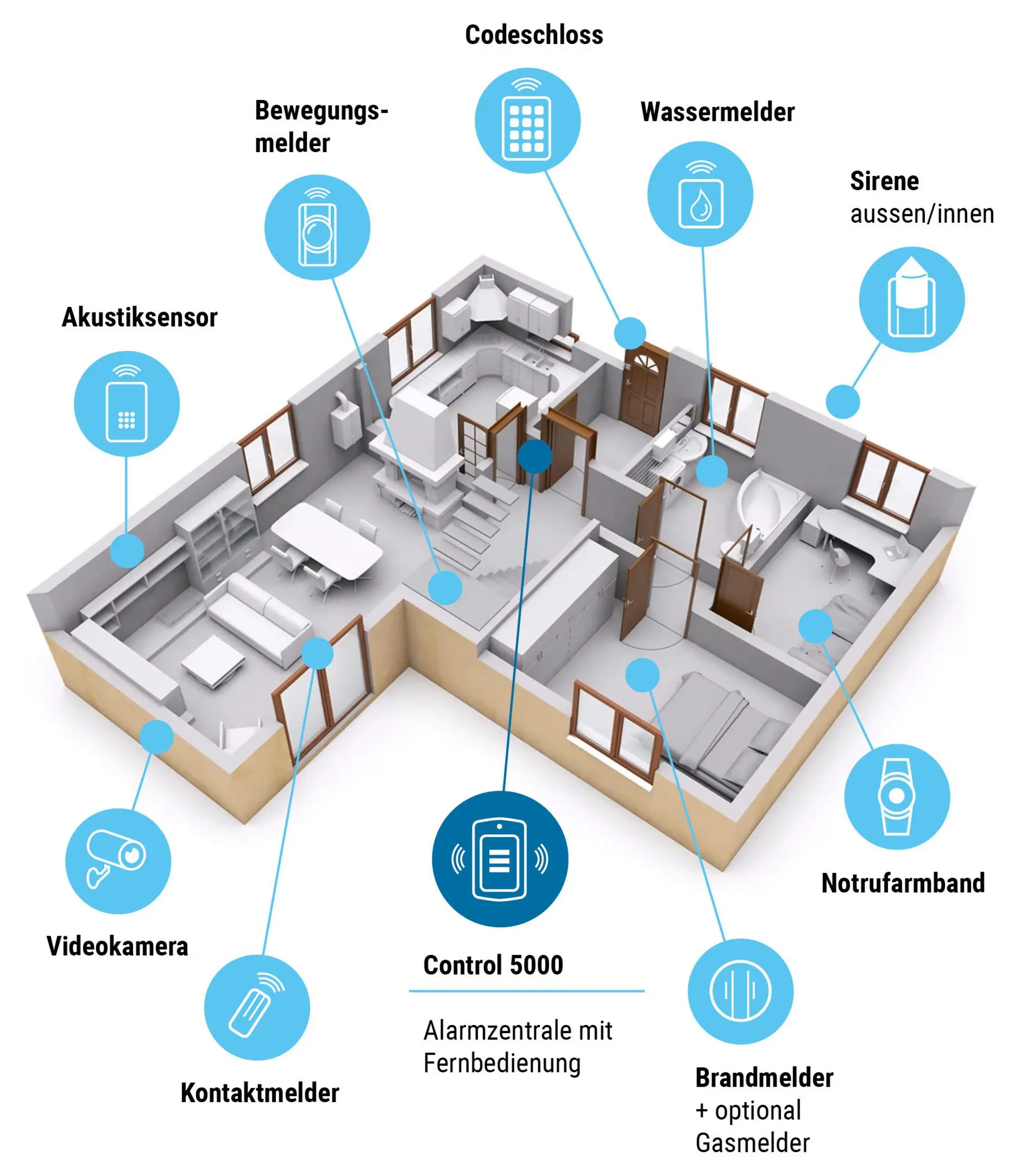 Die zusätzliche Innensirene verstärkt den Alarm im Haus und kann als Erweiterung für zusätzliche Bereiche verwendet werden. Hierbei wird die Innensirene an Orten im Objekt positioniert, wo die Alarmtöne aus der Zentrale nicht mehr zu hören sind. So bekommen Sie immer mit, wenn Sie von einem der Sensoren erfasst wurden und können den Alarm rechtzeitig abschalten.